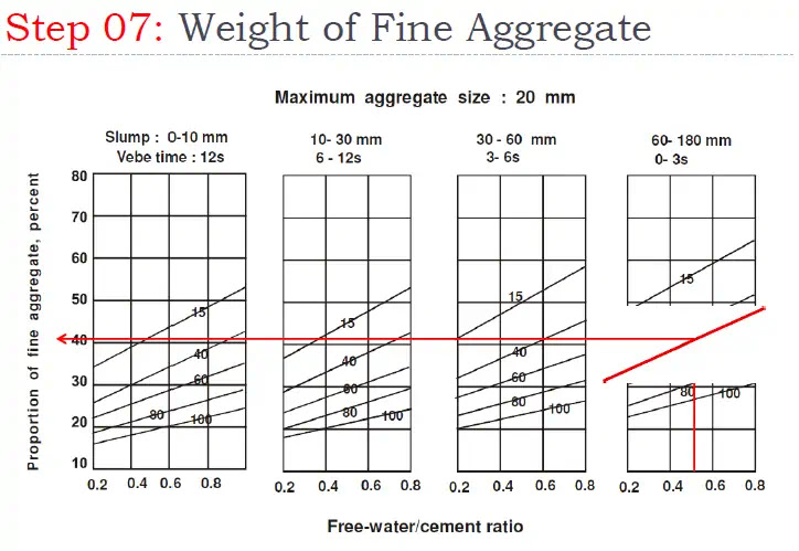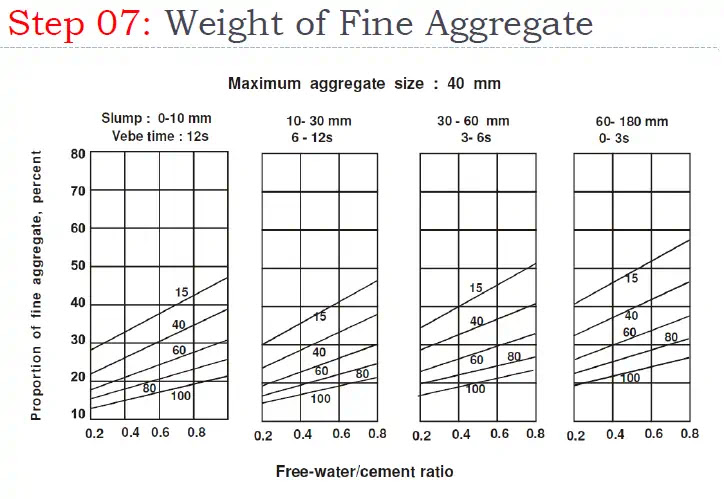 Then, the proportion of fine aggregate is determined in the total aggregate using below Fig. Fig. (a) is for 10 mm size, (b) is for 20 mm size and Fig. (c) is for 40 mm size coarse aggregate.