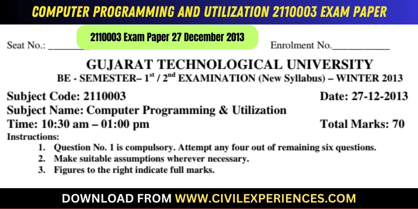 Here, On CivilExperiences.com You don't need to remember your GTU B.E. subject code for download Papers. Computer Programming and Utilization GTU Exam Papers 2110003 subject code.