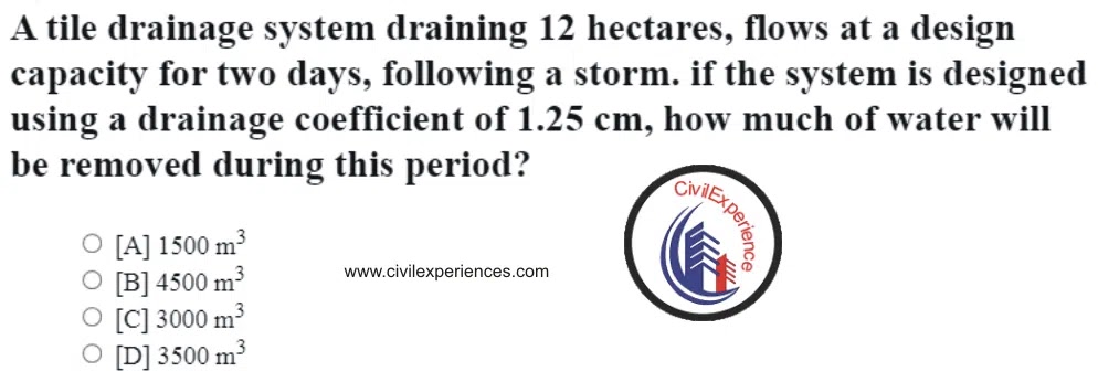 Correct answer for A tile drainage system draining 12 hectares, flows at a design capacity for two days, following a storm. if the system is designed using a drainage coefficient of 1.25 cm, how much water will be removed during this period is [C] 3000 m3
