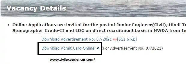 Now, click on ‘ Download Admit Card Online’, given under ‘Online Applications are invited for the post of Junior Engineer(Civil), Hindi Translator, Junior Accounts Officer, UDC, Stenographer Grade-II and LDC on direct recruitment basis in NWDA from Indian Citizens (Advertisement No. 07/2021)’.