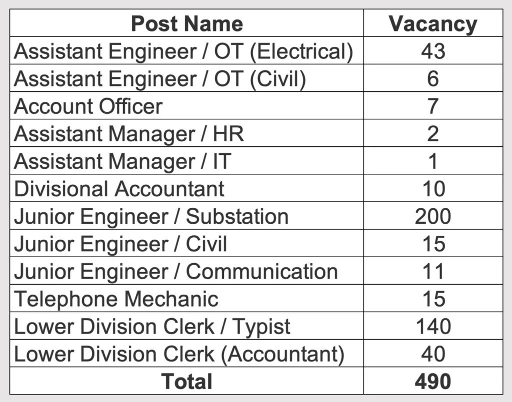 Total jobs vacancies notified by PSTCL job recruitment notice are 490.