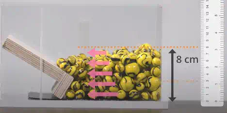 We again use a rubber sheet to prevent sliding, and we add some marbles. As before, the marbles generate a horizontal force that depends on the marble depth. You might be surprised that this wall can hold back 11 centimetres of marbles before it overturns.