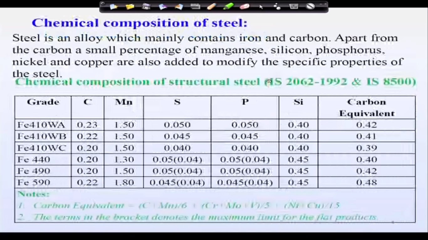 Here in IS 2062-1992 and IS 8500 the chemical composition of structural steel have been given So some of the chemical composition of the different structural grade of steel has been reported in this table like Fe410 of grade A, B, C the percentage of carbon might be shown (refer below Image) So different percentage of carbon, manganese then Sulpher, phosphorus, silicon and carbon equivalent has been given it