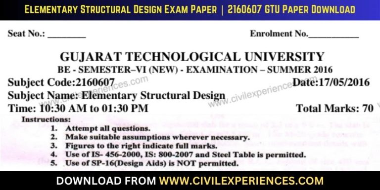 DOWNLOAD BE 6th SEM Elementary Structural Design GTU Paper 2160607 SUMMER 2016 PDF | Download GTU BE 2016 3rd Year 6th Semester SUMMER 2016 2160607 Elementary Structural Design Question paper | 2160607 | Elementary Structural Design